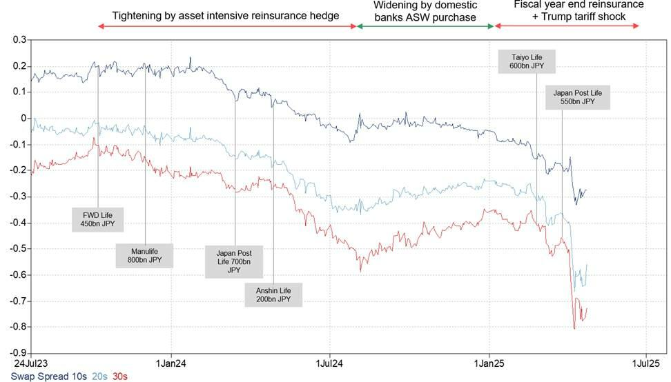寿险公司需求不足: 寿险公司的久期缺口已处于负值区域(截至2024年9月为-1.5年),因此难以持续产生对长期国债的需求。特别是40年期国债,在新偿付能力规则下的负债折现曲线使其天然买家稀少。此外,过去一些买家甚至已转变为日本国债的净卖家,导致供需前景极度悲观。 财政担忧加剧: 随着参议院选举临近,几乎所有反对党都呼吁削减消费税。如果执政的自民党遭遇重大失败,日本的财政前景担忧将显著加剧。如果这导致日本国债评级下调,长期国债的需求可能会进一步恶化。 资产密集型再保险影响: 2023年10月之后,一系列大型的资产密集型再保险交易被宣布。在这种商业模式中,再保险公司接管日本寿险公司的资产和负债,并用更高收益的产品替代资产以赚取利差。在此过程中,日本国债常被出售,这对长期国债的供需平衡产生了负面影响。